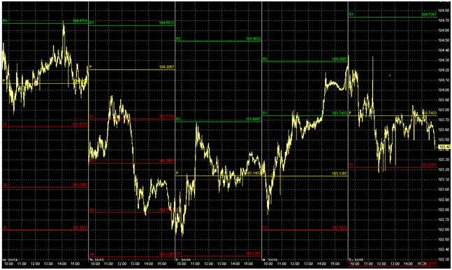 Đây là hình thức cơ bản nhất của việc sử dụng các điểm pivot. Để giúp bạn có thể giao dịch được nhiều hơn, các điểm trục có thể được sử dụng như một cơ sở để tính toán một số mức hỗ trợ và kháng cự. Sau đây là hình thể hiện các điểm Pivot hàng ngày được rút ra vào một biểu đồ giá trong ngày như đường màu vàng.