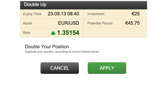 Chiến lược Double up được sử dụng bởi một nhà đầu tư là tại một vị trí mạnh và đầu tư đang tìm kiếm rất tốt để tạo ra lợi nhuận cao. Sử dụng chiến lược này , các nhà đầu tư quyền chọn nhị phân có thể tăng gấp đôi mức lợi nhuận ban đầu của họ trong khi các thông số sẽ giữ nguyên như khi lúc đầu đầu tư đã được thực hiện.
